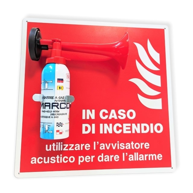 Cartello porta segnalatore acustico. Realizzato in alluminio composito con spessore 3 mm. Stampa digitale rossa, dotato di gancio per l'alloggiamento della bomboletta e di rapida estrazione in caso di emergenza.