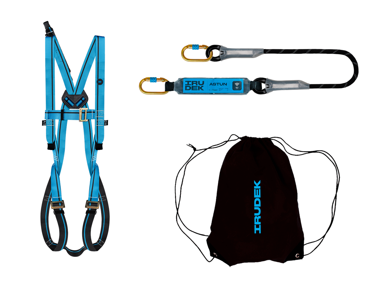 Kit anticaduta pronto all'uso, certificato per poter dissipare la forza di impatto di una caduta dall'alto. Composto da imbracatura Light Plus2 EN361, 2 connettori a vite EN362, 1 cordino mt 1,5 con assorbitore di energia EN355, sacca di contenimento.