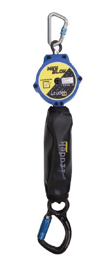 Retrattile a nastro tessile da 2 metri, completo di assorbitore di energia, anello superiore rotante e un connettore da 22 mm e uno da 21,5 mm twistlock. L'assorbitore di energia permette l'uso certificato in presenza di spigolo vivo. Fornito con moschettone in alluminio con chiusura a vite. Conforme EN 360.