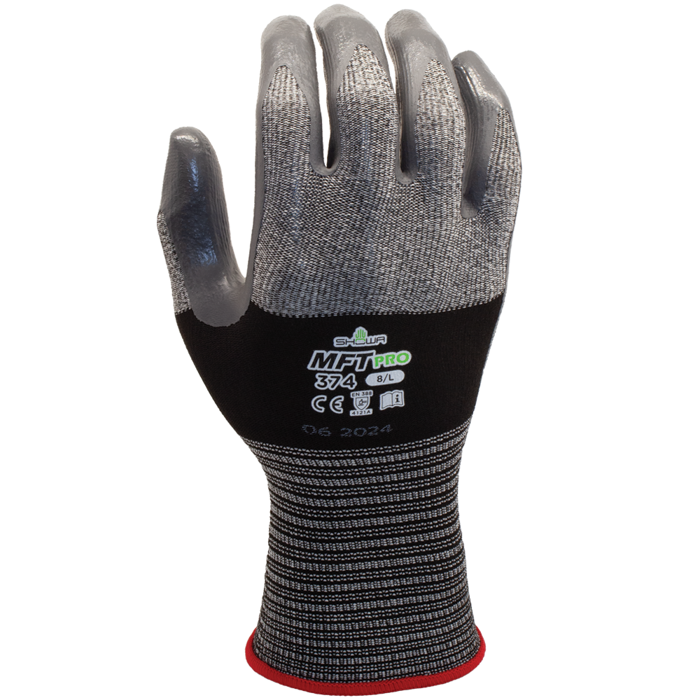 Guanto SHOWA MFT PRO 374 con tecnologia MicroFiber (MFT PRO). Rivestimento piatto in nitrile sul palmo su maglia senza cuciture ingegnerizzata calibro 13 con fodera in microfibra e filato di nylon.